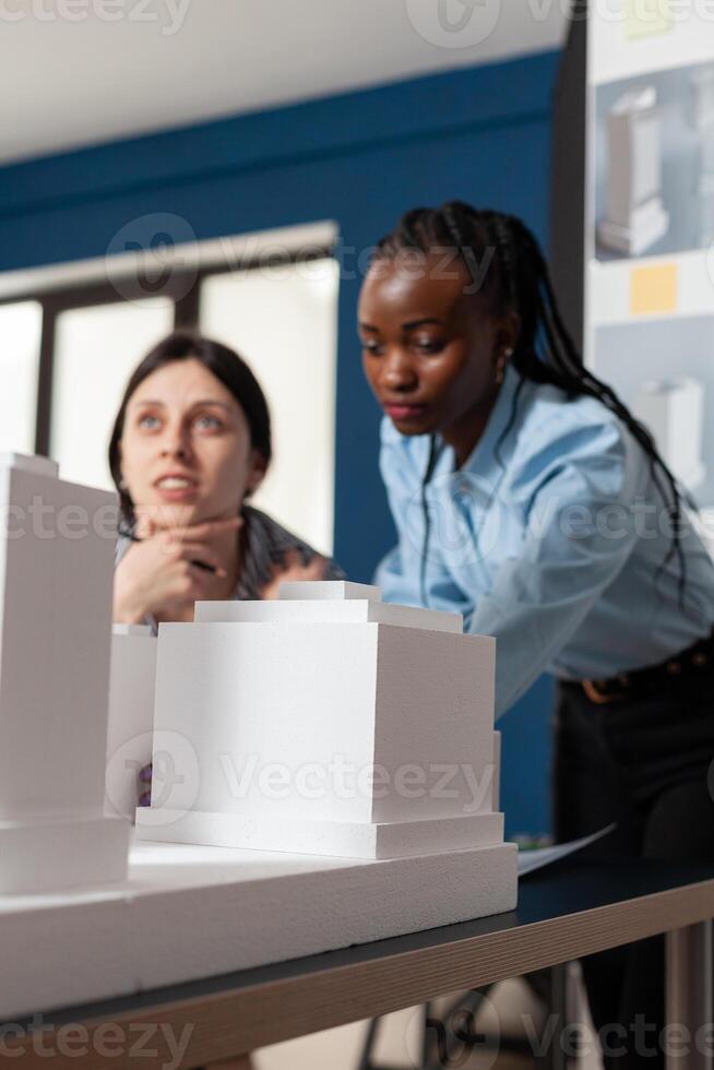 Detail view of white foam maquette on design table in front of architects team looking at skyscraper scale model and blueprints. Closeup of urban development architectural buildings project. Pro Photo