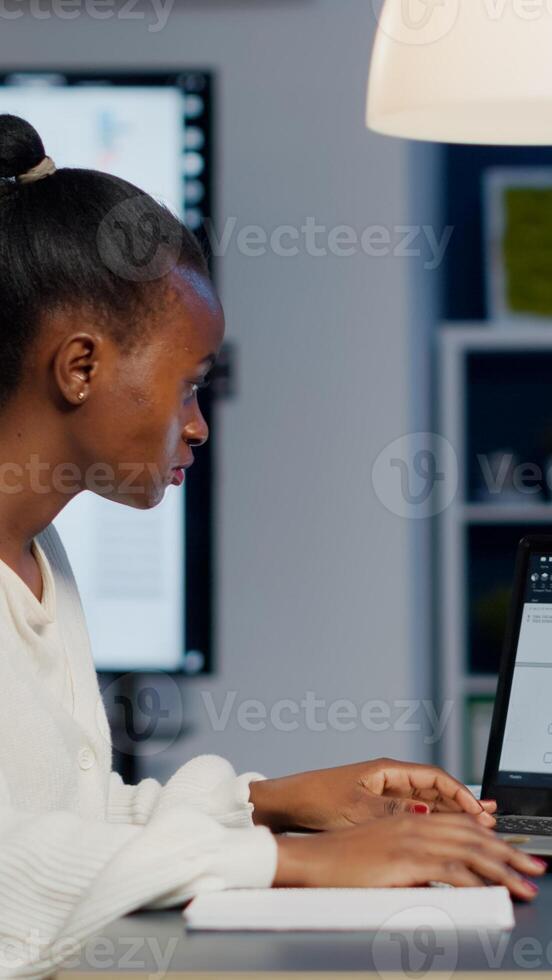 African architect analysing digital plans from laptop working in start-up business office overtime. Designer using cad software to design a 3D concept of buildings creating late at night Pro Photo