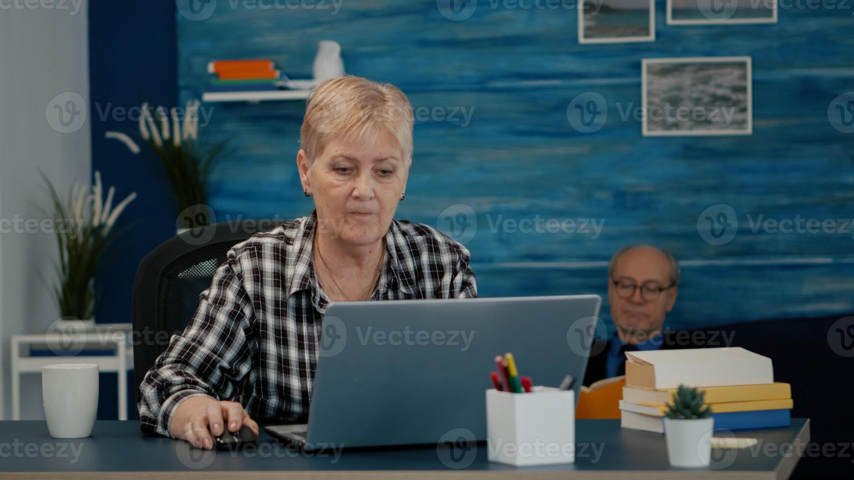 Mature caucasian lady working on laptop at home workplace, typing on computer drinking coffee. Experienced manager doing financial project during self isolation while husband reading a book in background Pro Photo