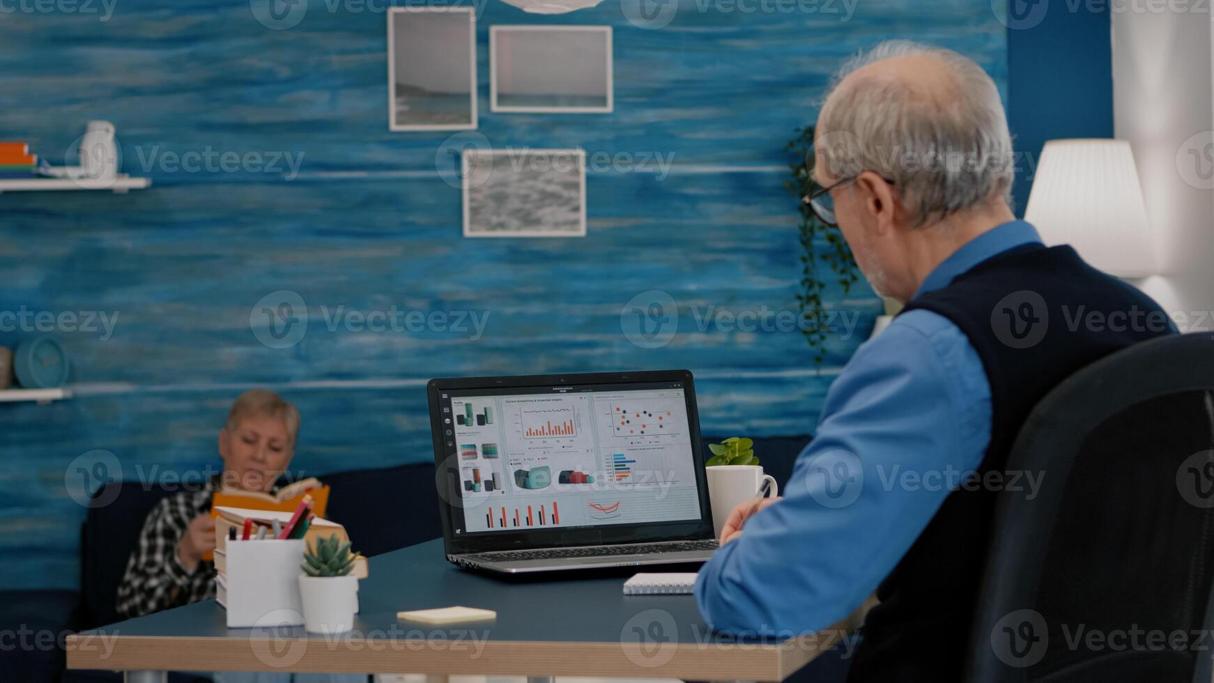 Middle aged senior older man e-learning online concept, watching business graphs, charts on laptop computer remote working, social distance learning, writing noteson notebook from home office. Pro Photo