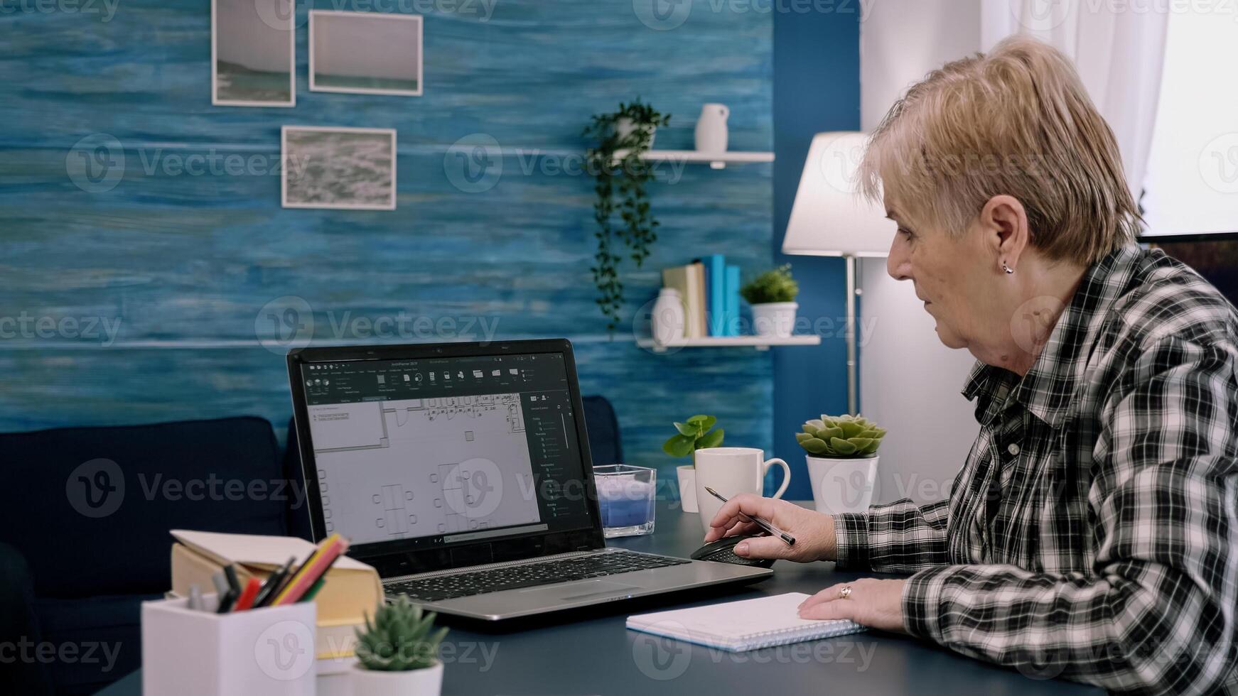 Middle aged woman engineer working with architectural plans, cad software on laptop computer. Designer using digital arhitecture blueprints of buildings working overtime, creating and studying Pro Photo