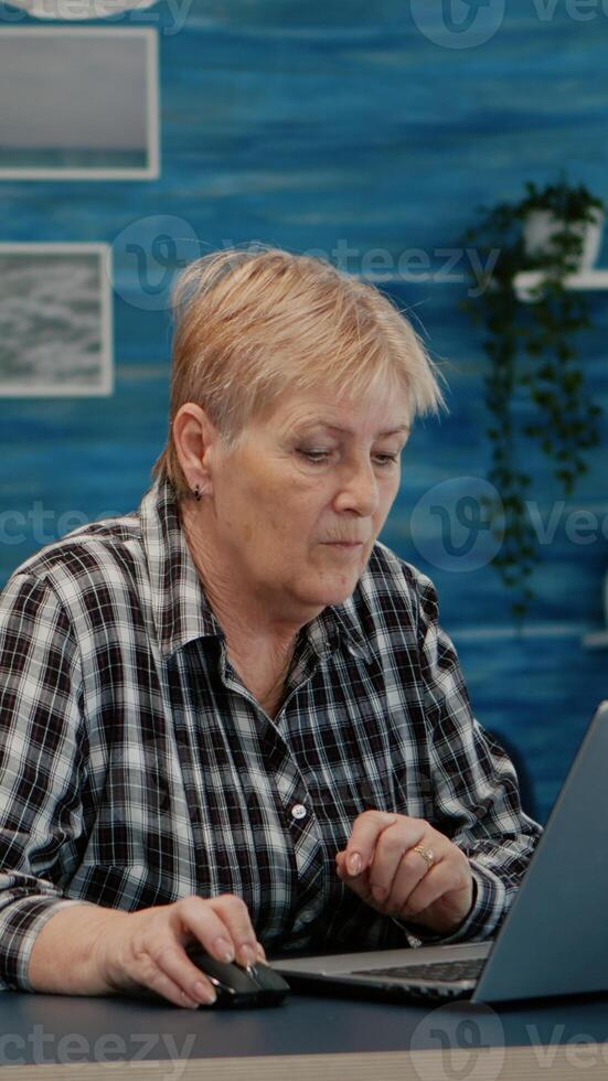 Mature caucasian lady working on laptop at home workplace, typing on computer drinking coffee. Experienced manager doing financial project during self isolation while husband reading a book in background Pro Photo