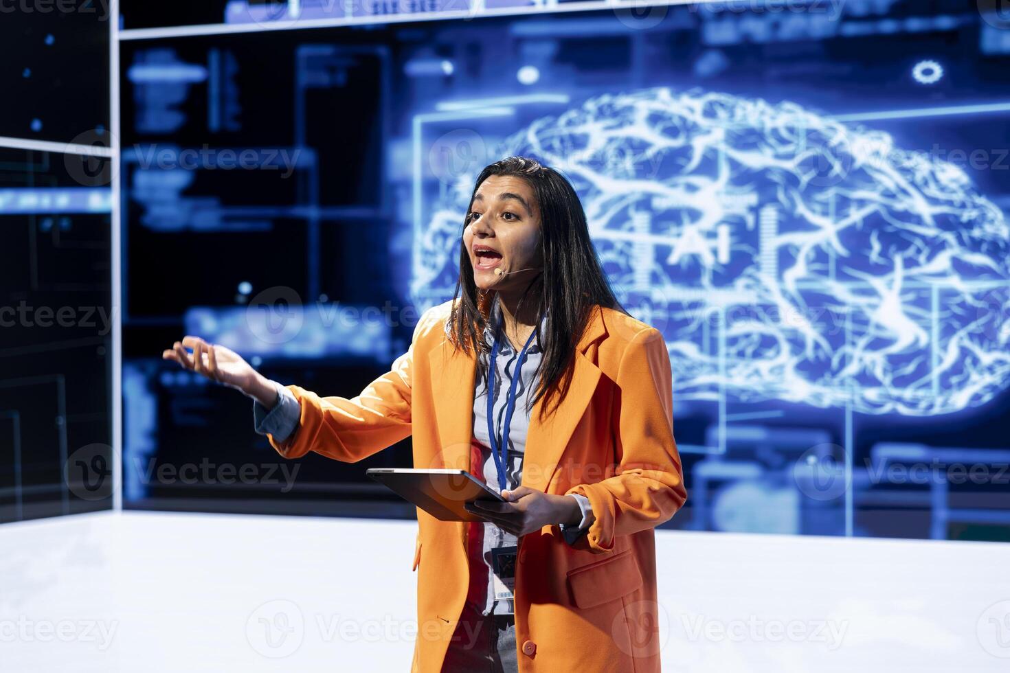 Woman using mic and tablet to do presentation at event bringing together researchers to explore developments in AI and machine learning. Engineer using device artificial intelligence summit speech Pro Photo
