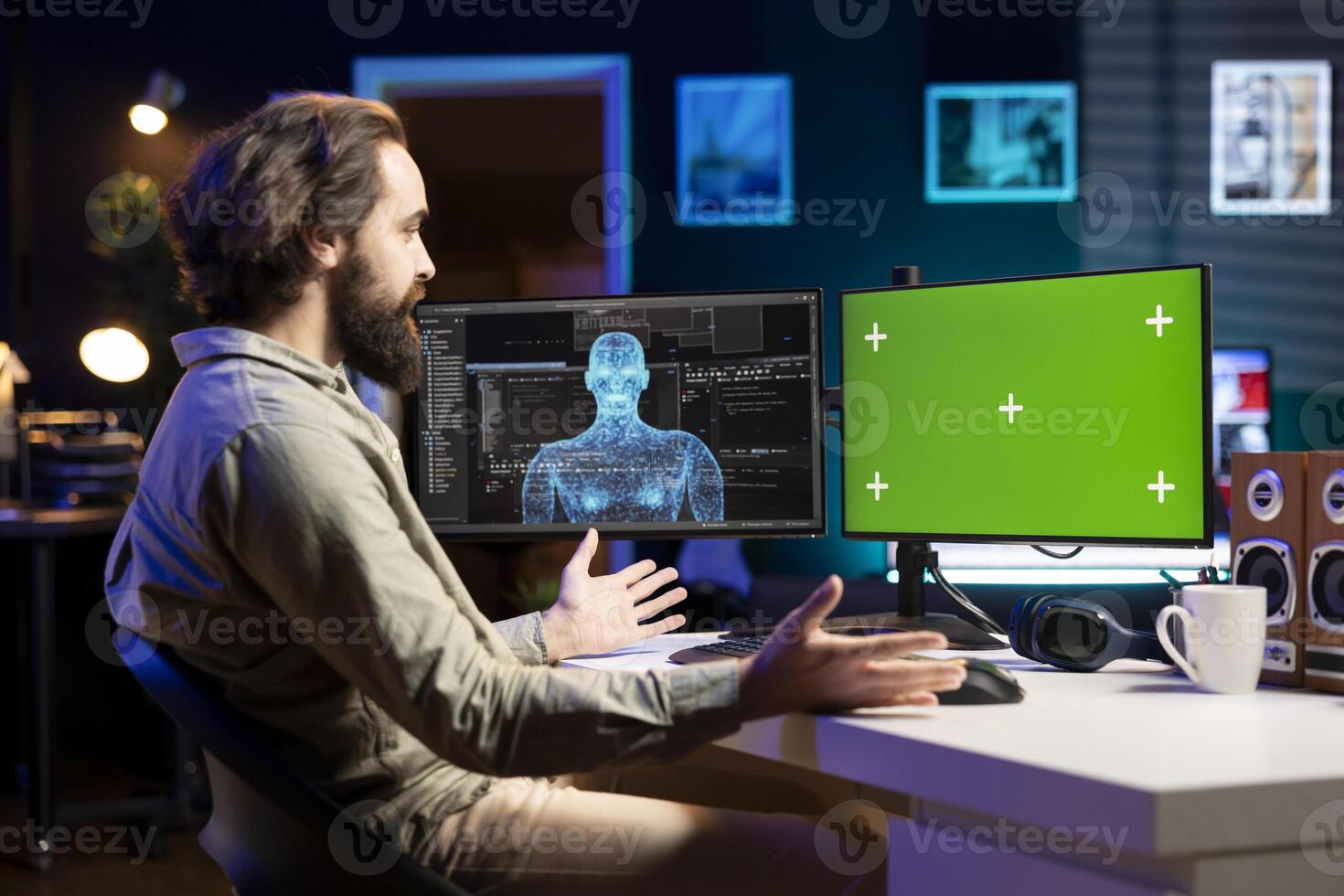 Software developer unable to believe eyes after seeing AI gaining humanoid form on green screen monitor. Computer scientist surprised by artificial intelligence materializing on chroma key display Pro Photo
