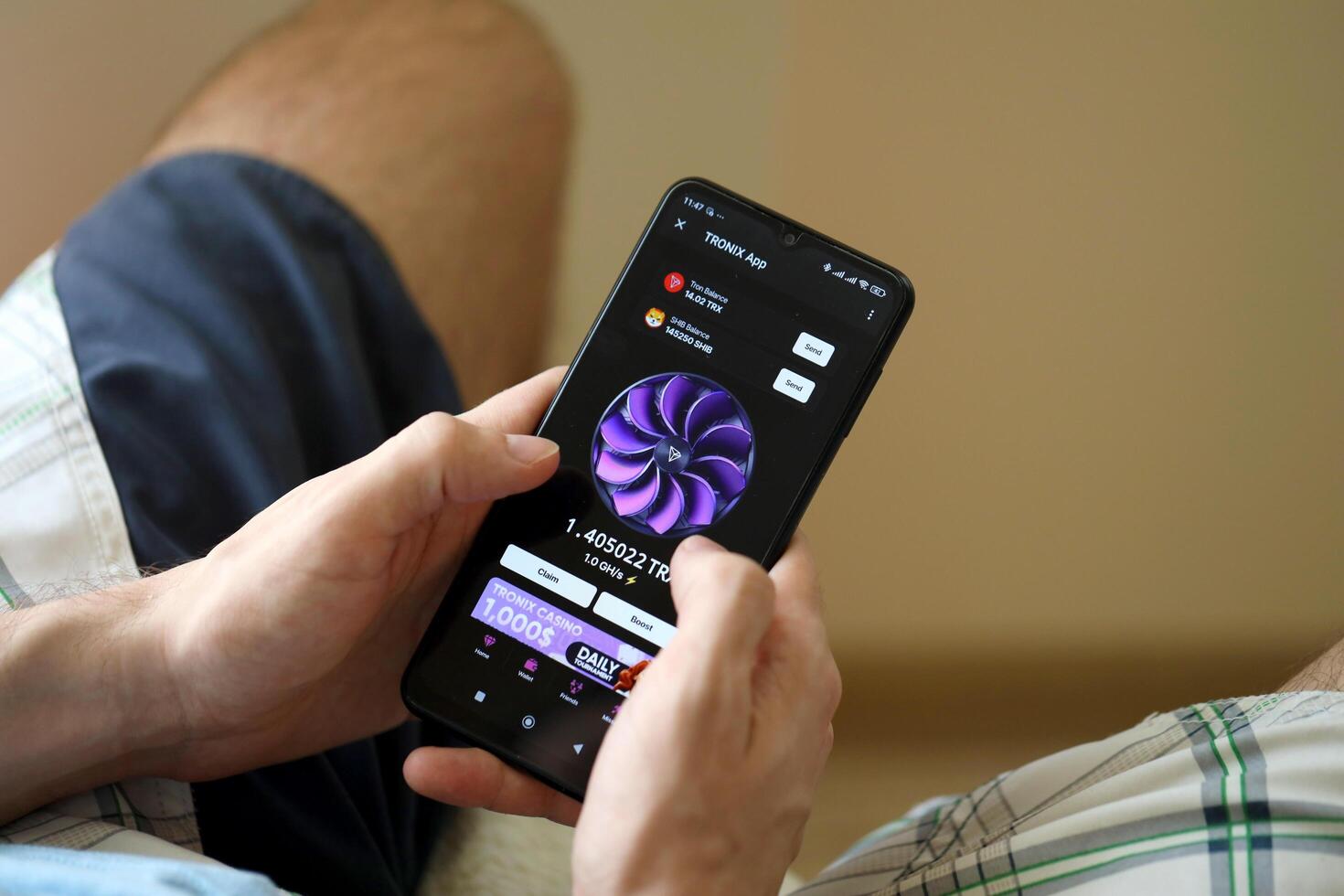 KYIV, UKRAINE - APRIL 20, 2024 Tronix App telegram bot on smartphone screen. Tronix App is a viral Telegram based crypto game for earn TRX tokens by managing virtual crypto exchange