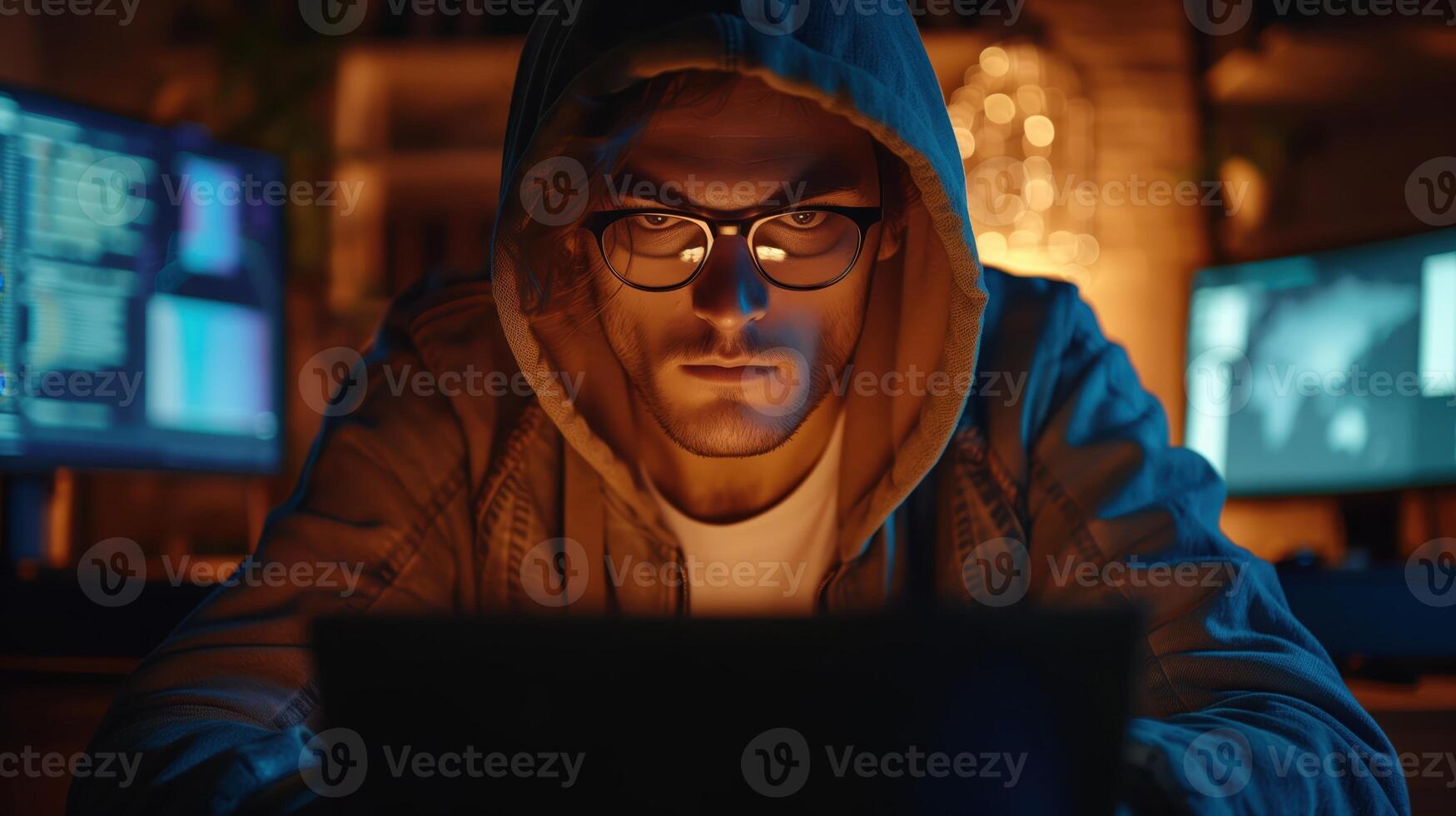 Mysterious Hooded Hacker Working on Computer in Dark Room with Multiple Monitors Pro Photo