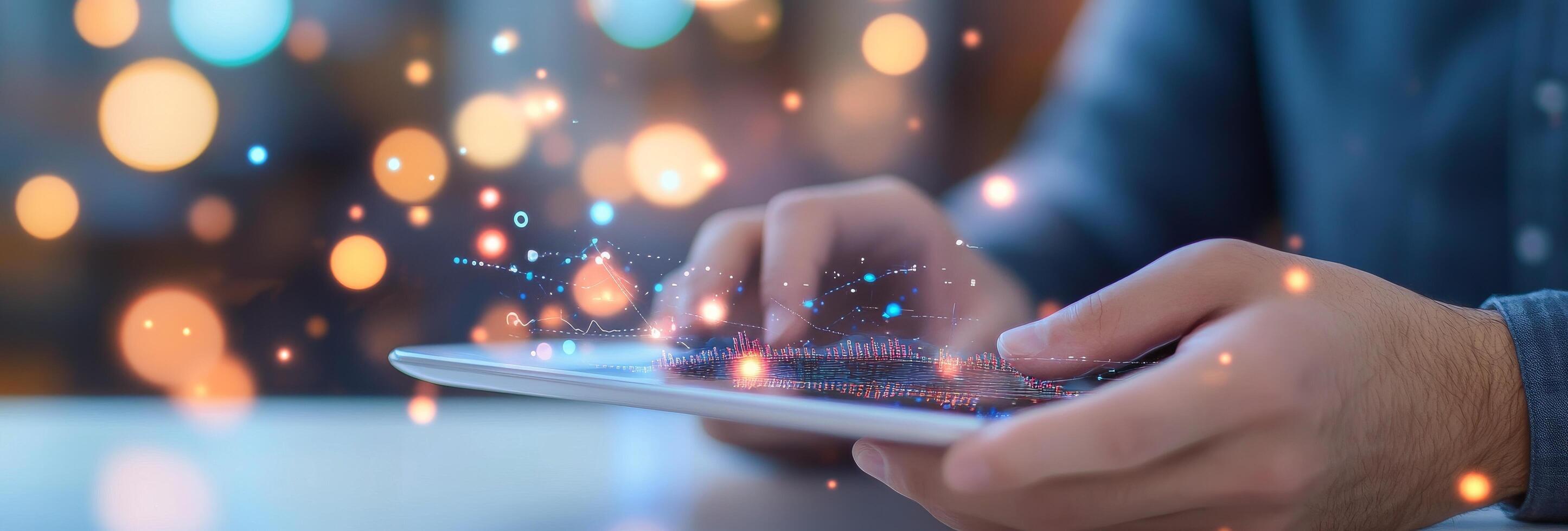 Person analyzing financial data on a tablet with colorful graphs and blurred background lights photo