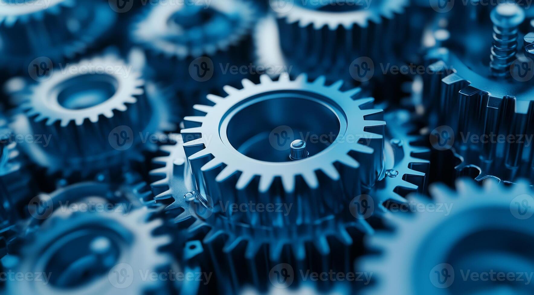 A closeup view of intricately interlocked blue metal gears, which symbolize the essential elements of teamwork, precision, and careful mechanical engineering in advanced machinery and automation Pro Photo