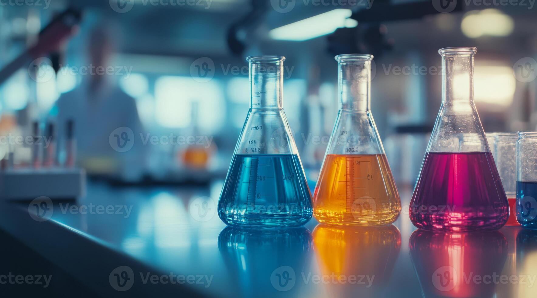 A vibrant lab table displaying glass flasks with blue, orange, and pink liquids, set in a scientifically engaging environment with a softly blurred background for a dynamic atmosphere Pro Photo