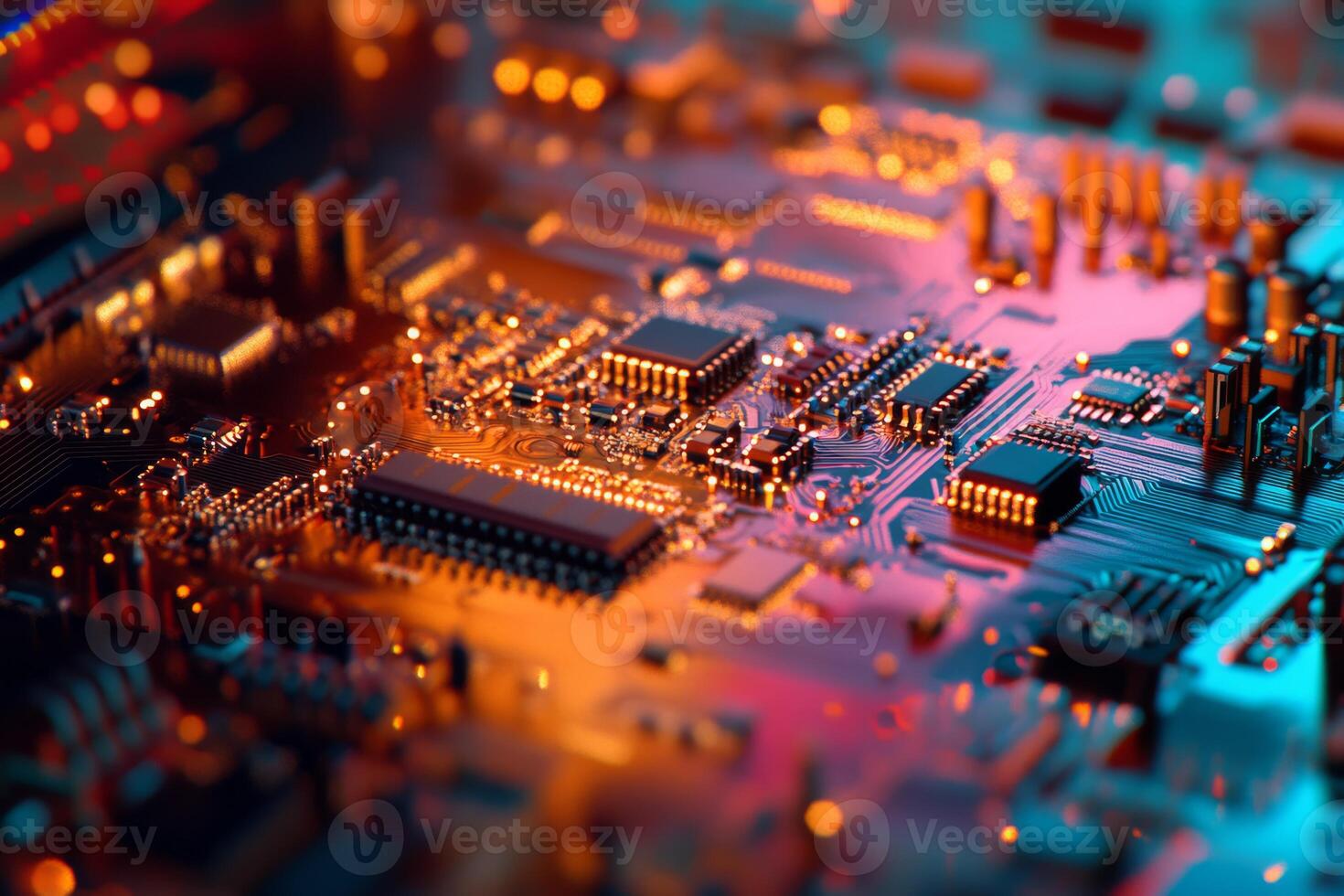 This image showcases an intricate and detailed view of microchip circuitry, effectively highlighting the advanced technology and innovative design features that characterize modern electronics today Pro Photo