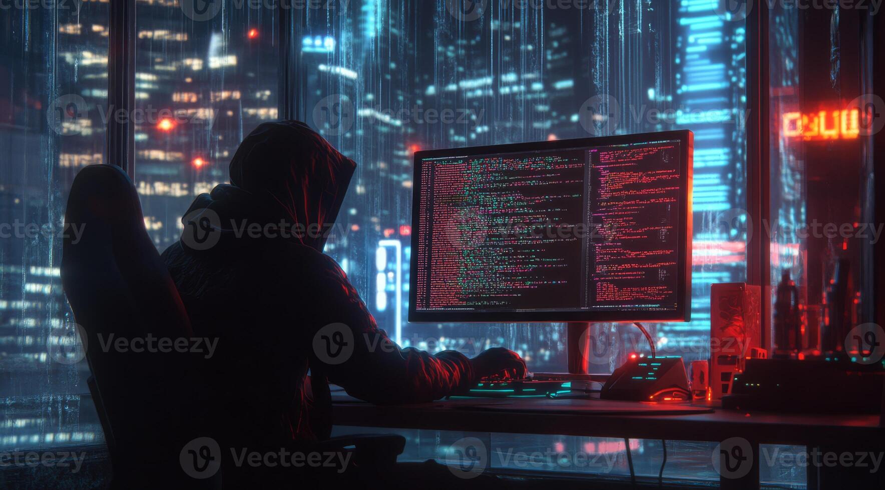 A skilled hacker sits at a hightech computer, accessing intricate data in a vibrant, neonlit city that embodies advanced hacking and a captivating digital world with endless possibilities Pro Photo