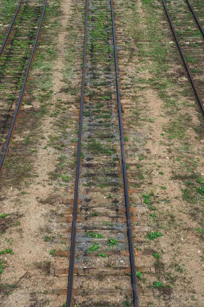 Top view of the empty railway tracks. View of the rails from above Pro Photo