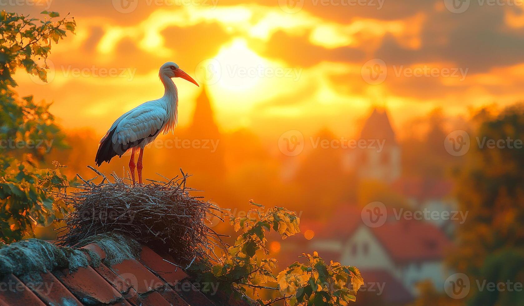 A white bird is perched on a nest in a tree. The sun is setting in the background, casting a warm glow over the scene. The bird appears to be looking out over the city below, taking in the view Pro Photo