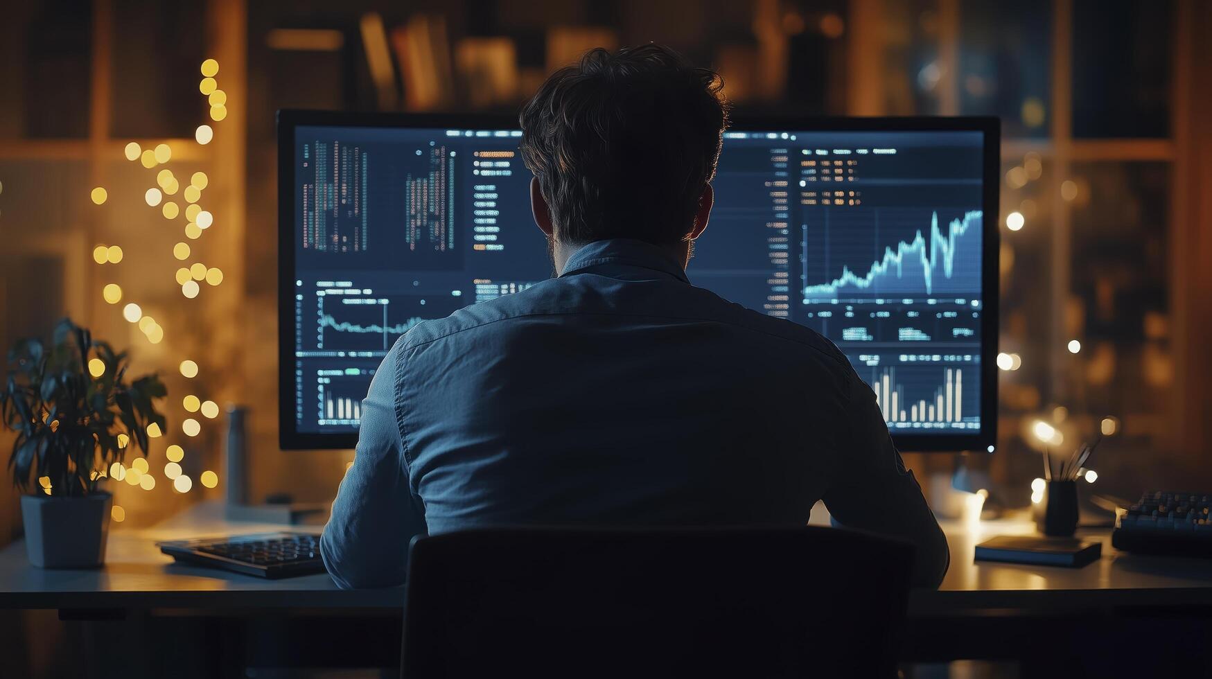 Late-night financial analyst working under the glow of multiple monitors displaying financial data photo