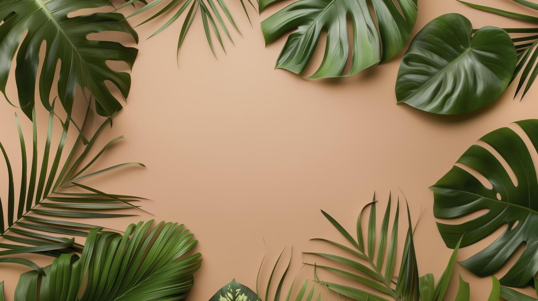 Tropical jungle leaves creating a border on a pastel background with space for text in the center photo