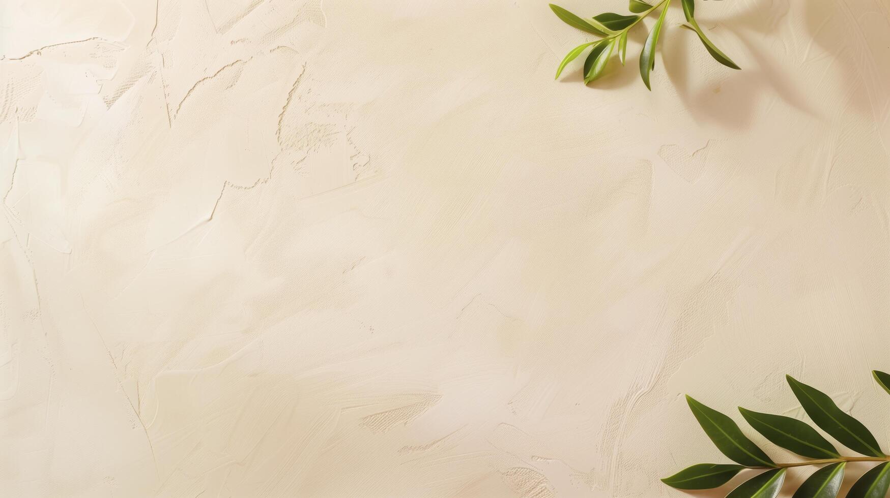 Green leaves on textured plaster wall creating a natural frame with minimal background and space for text photo
