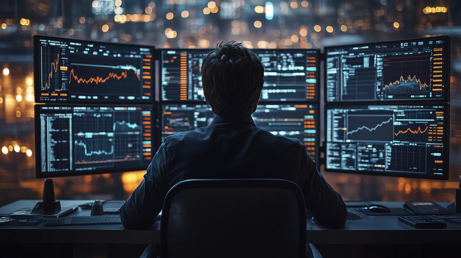Financial analyst is working late, using multiple monitors displaying analytics data Free Photo