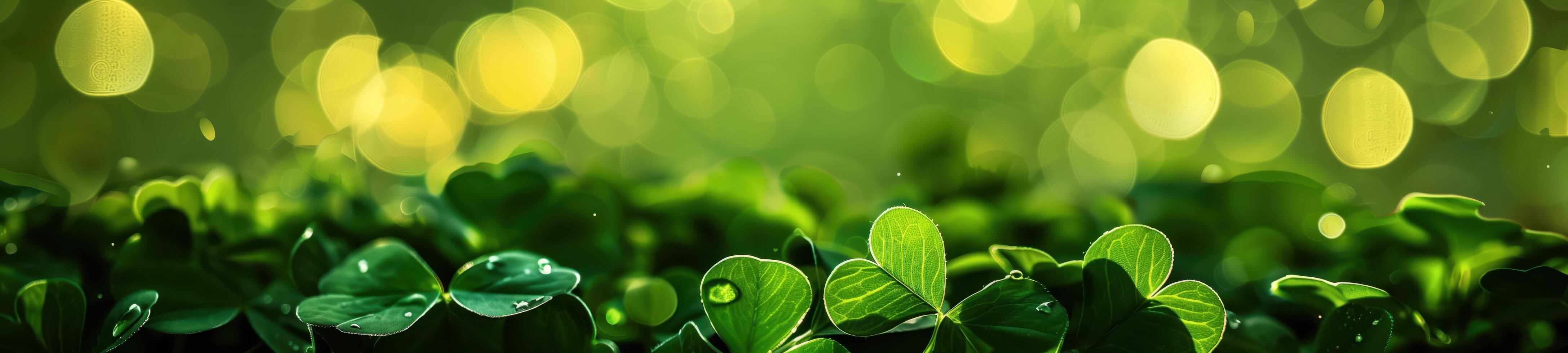Green clover leaves with dew drops are sparkling in the sun on a blurred background with bokeh photo