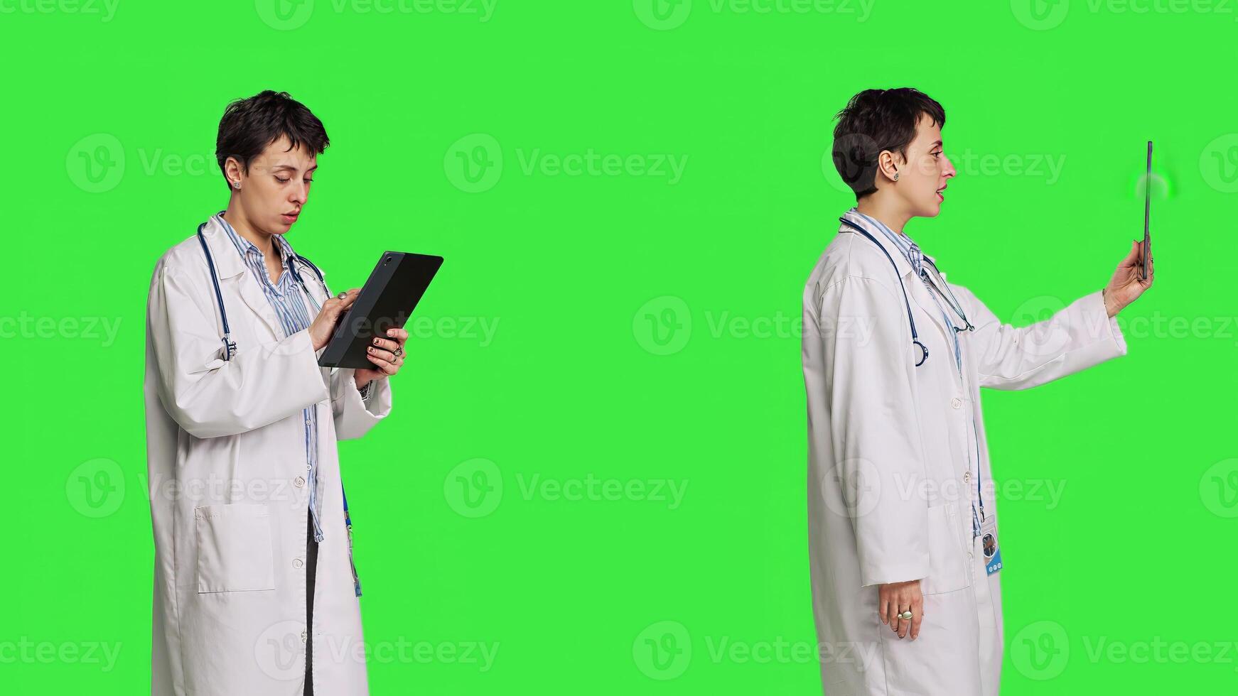 General practitioner browsing online sites and waving on videocall, using a tablet for multiple actions on the internet. Woman medic navigates on web and attends videoconference exam. Camera B. Pro Photo