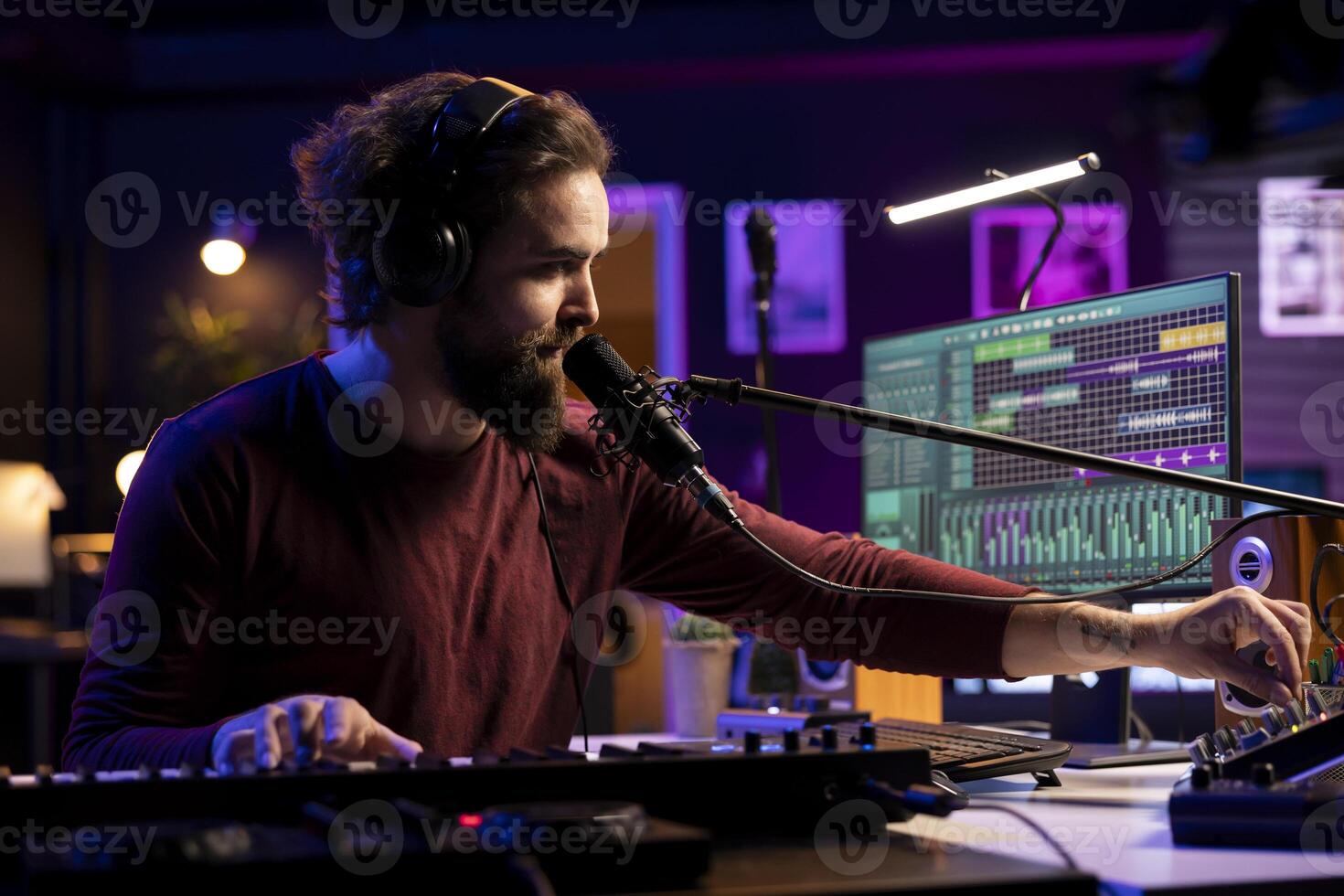 Producer composing a modern song in his home studio, creating music on mixing console and daw software interface. Talented artist computer and controls panel to produce soundtracks. Pro Photo
