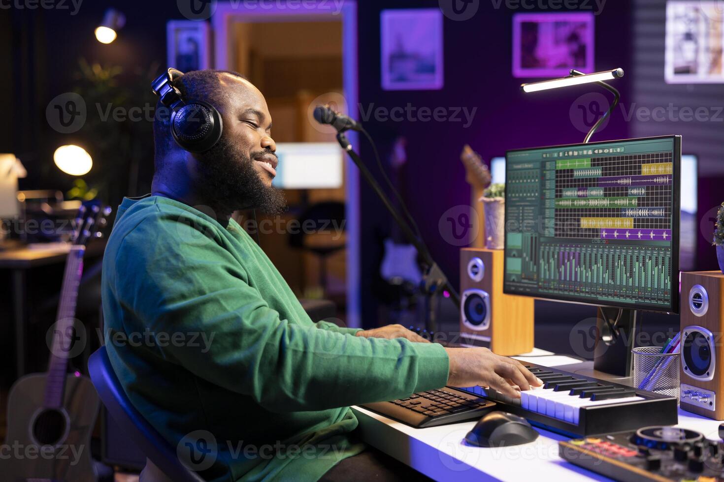 Sound technician playing piano notes to edit with DAW software in his home studio, working at night on producing new songs with electronic synthesizer. Producer composing tracks on midi controller. Pro Photo
