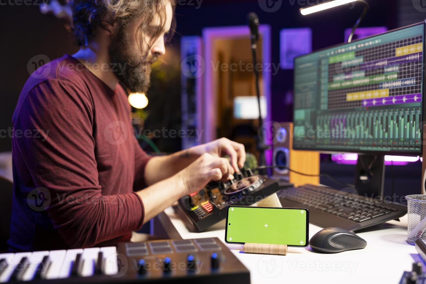 Audio engineer uses knobs on stereo gear for mixing and mastering session, having a smartphone with greenscreen display in home studio. Musician learning to edit tunes with daw software. Pro Photo