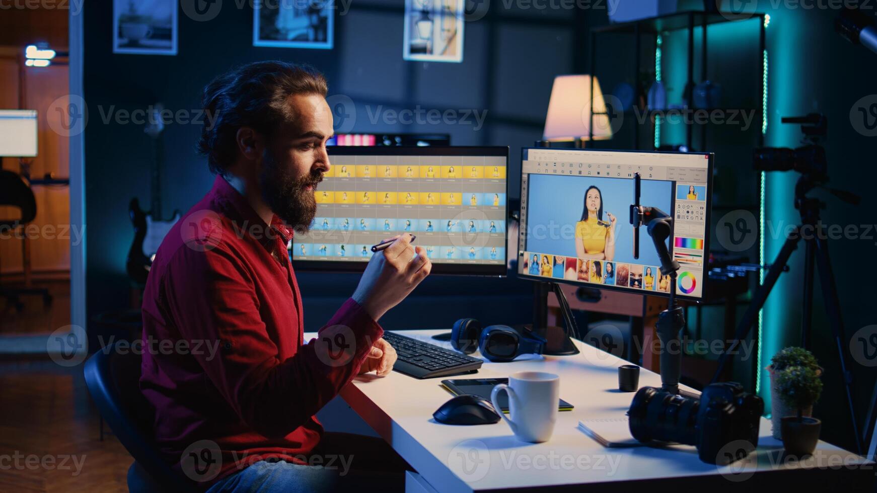 Photographer filming online tutorial on how to use photo editing software. Freelancer recording internet guide using smartphone, teaching how to navigate photographs retouching program Pro Photo