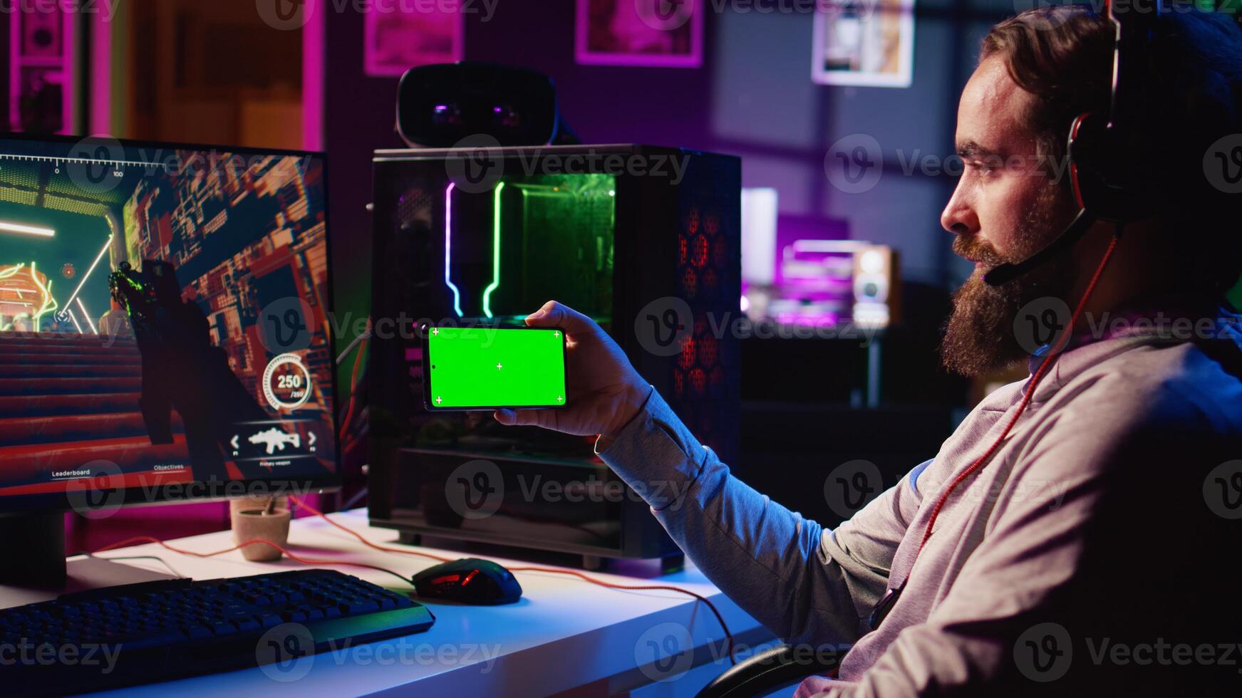 Man watching tutorial on mockup phone while playing first person shooter videogame with gun shooting laser bullets. Gamer learning to play game by looking at online guide on chroma key device Pro Photo