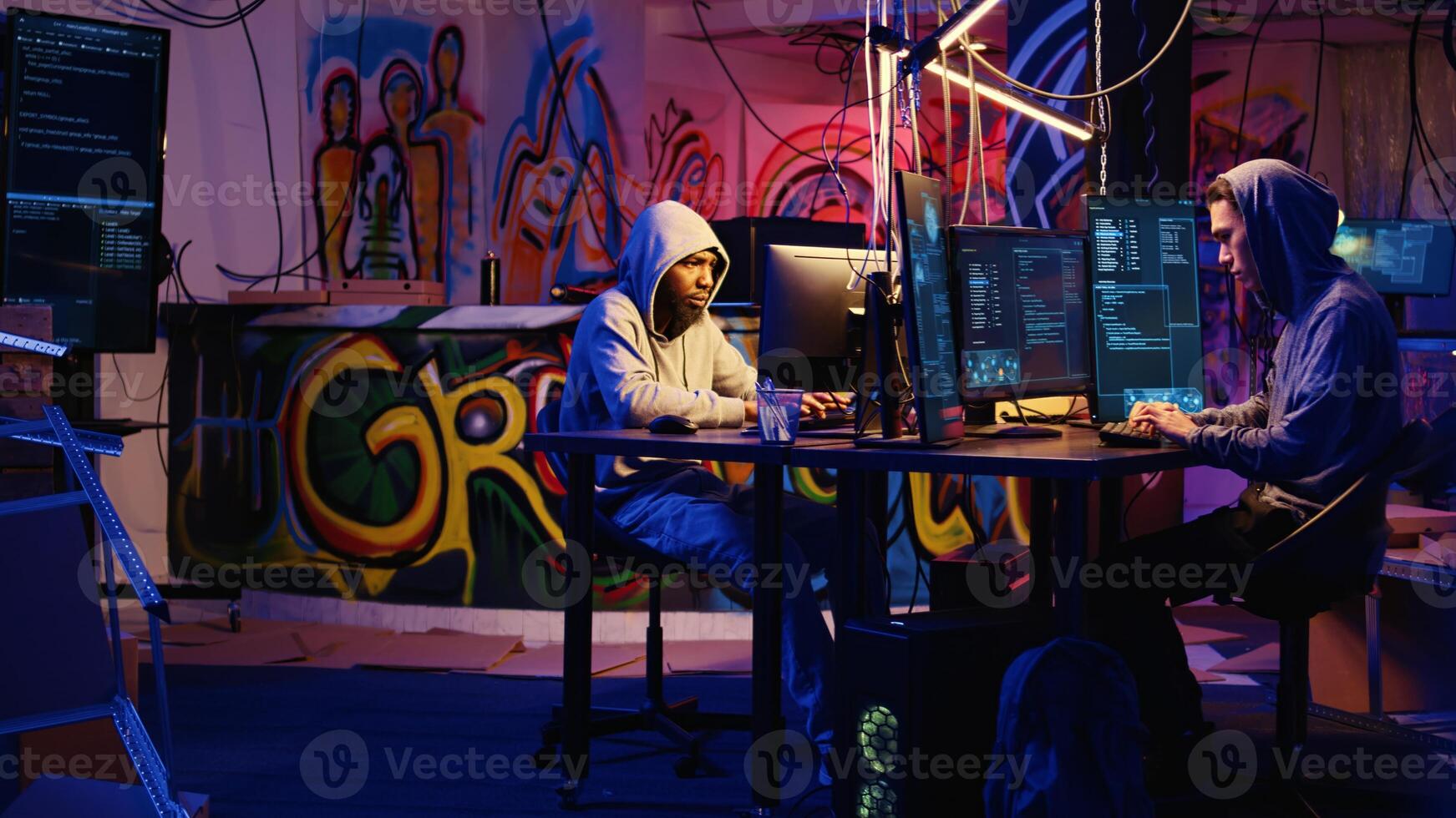 Team of hackers typing fast on keyboards in graffiti painted hideout, rushing to finish developing spyware software in order to use it to gather data from users computers without their knowledge Pro Photo