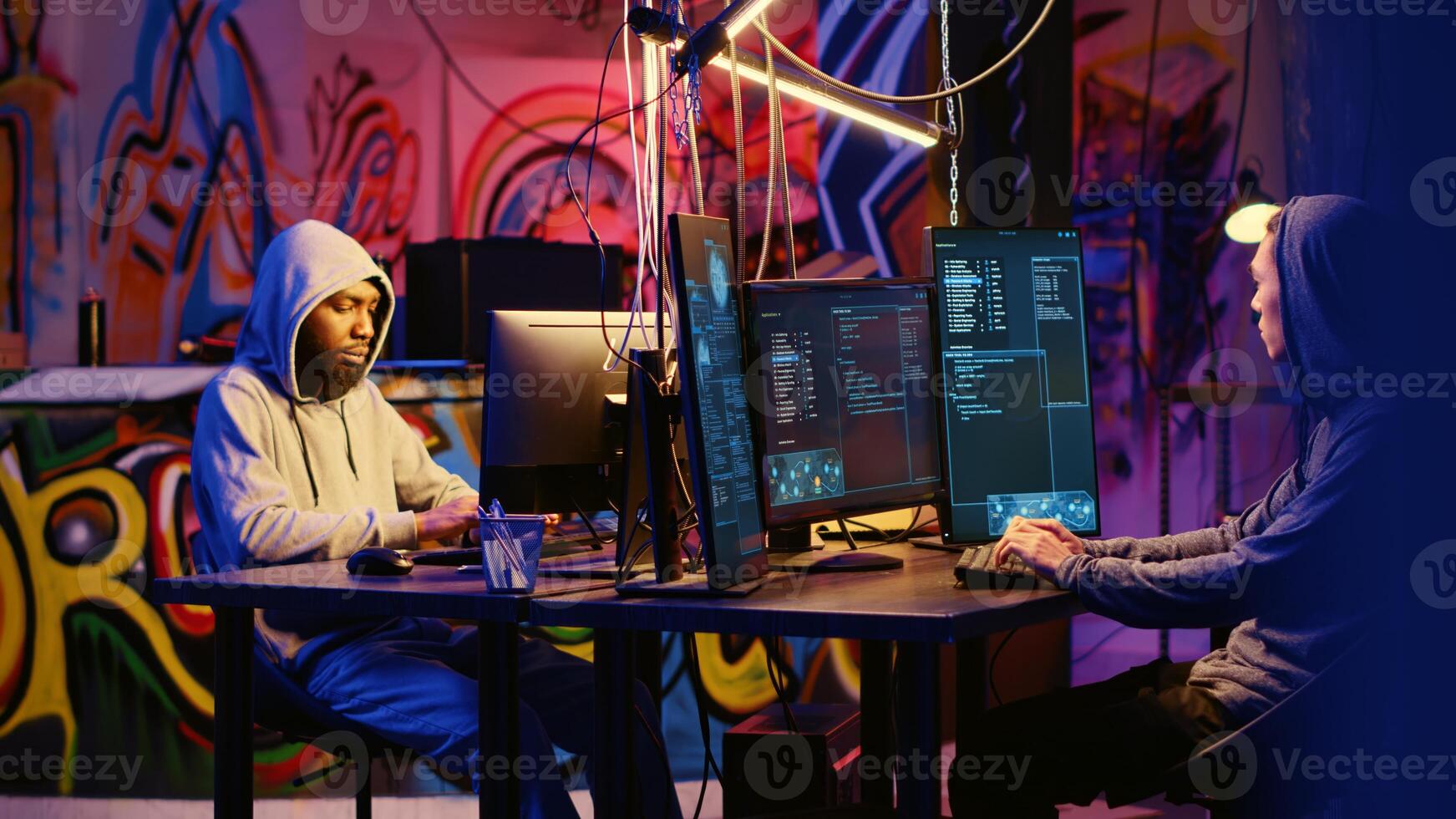 Evil hackers doing data breaches and financial theft in graffiti painted hideout. Rogue programmers stealing users bank account credentials, targeting low security passwords Pro Photo