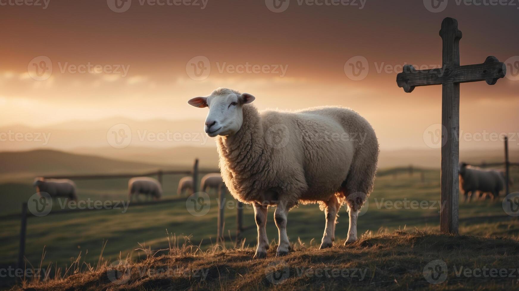 A cross is in the middle of a field with a sheep standing in front of it. Pro Photo