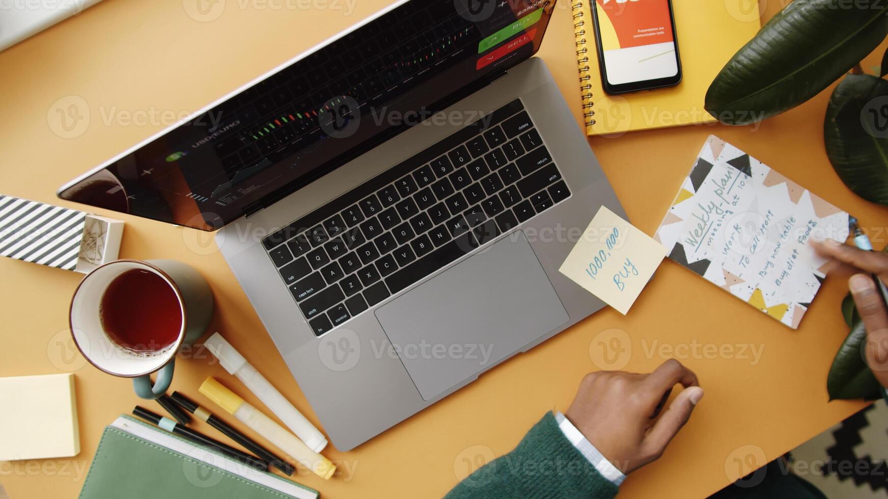Top view of male trader analyzing stock market data while sitting at the office workstation with multiple computers Pro Photo