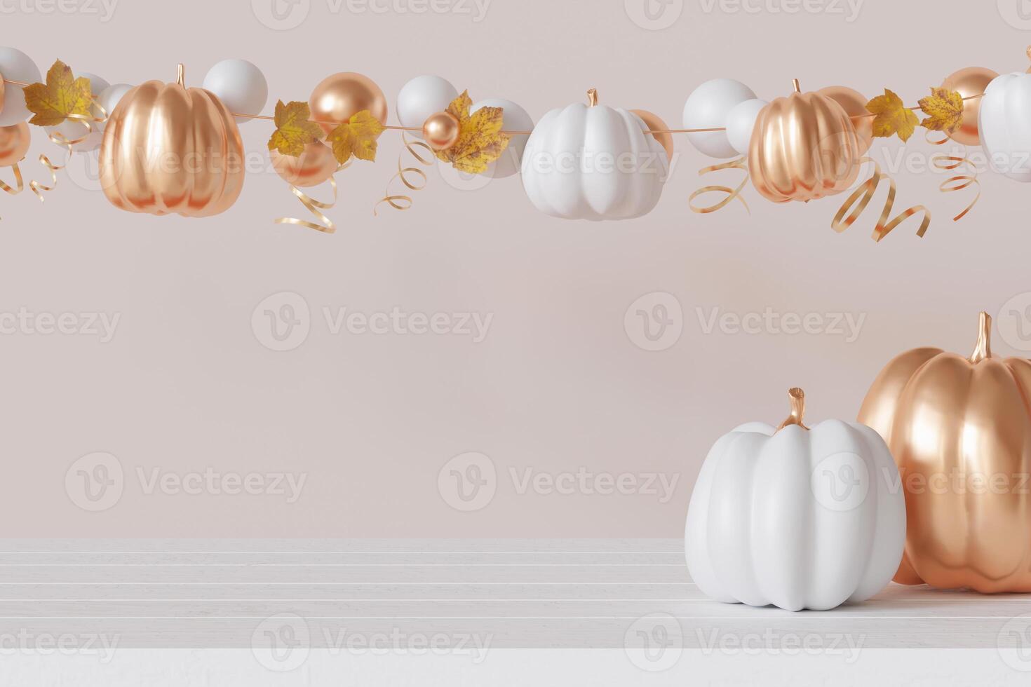 Halloween themed tabletop with empty space for product display, golden and white pumpkins on neutral, beige background. Mock up for product presentation, merchandise. Table front view. 3D. Pro Photo