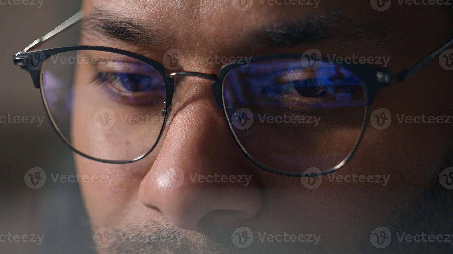 Close up businessman in eyeglasses working with computer data crypto analyzing cropped view male eyes in glasses looking at laptop monitor screen blue light reflection man business programming codding Pro Photo