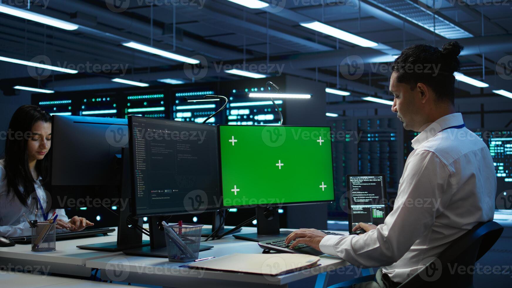 Engineer working with chroma key PC in data center used for managing gear energy consumption. Employee using isolated screen monitor in workspace used for automation in server farm, camera B Pro Photo