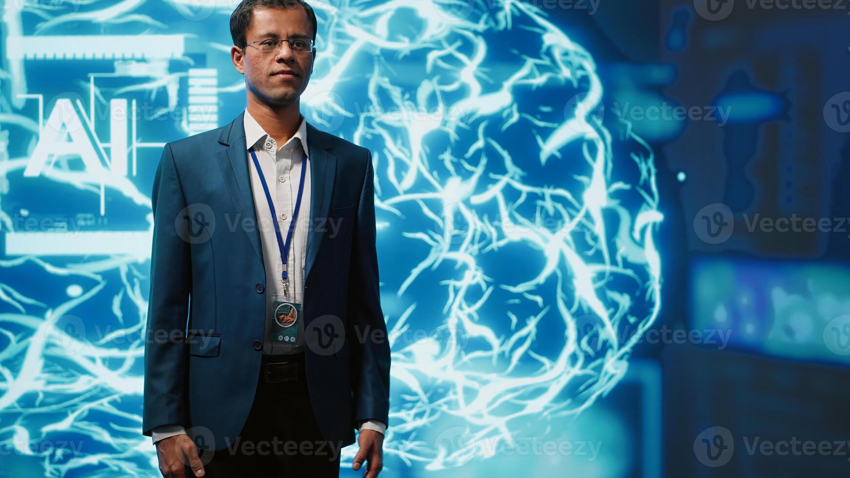 Upbeat engineer in startup doing advancements in AI field. Portrait of happy man standing with arms crossed in front of cutting edge display featuring AI and neural network graphics, camera A Pro Photo