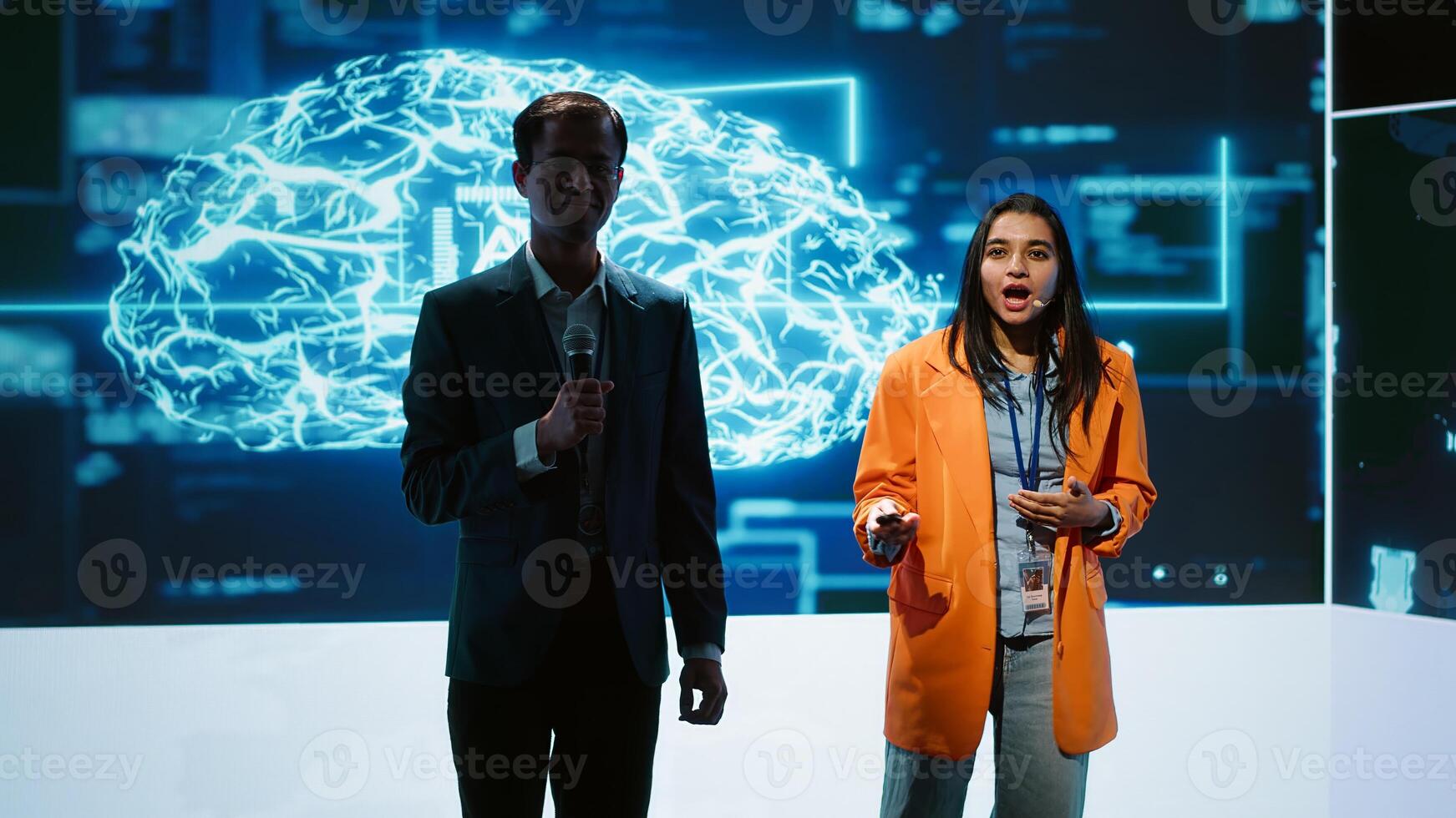 Tech specialists discussing during keynote summit presentation, exploring successful implementation of AI in driving forward businesses, sharing latest artificial intelligence innovations, camera A Pro Photo