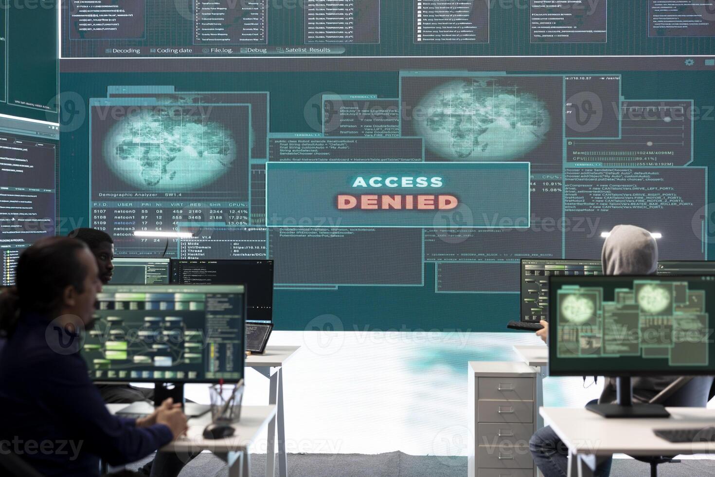 Displeased irritated team of hackers with denied access message on a big screen in governmental operations agency. Experts struggling to break into databases and steal server information. Pro Photo