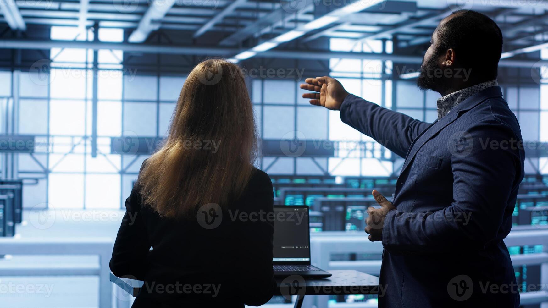 Team of engineers in data center doing brainstorming and running error checking utilities to fix problems. Teamworking colleagues in server hub looking for network issues affecting rigs, camera A Pro Photo