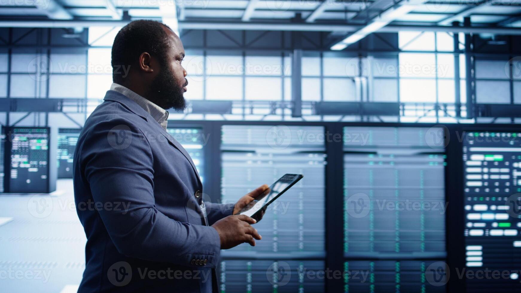 Technician walking in server room, doing checkup, inputting data on tablet of needed fixes. IT professional working in data center facility housing storage infrastructure, camera B Pro Photo