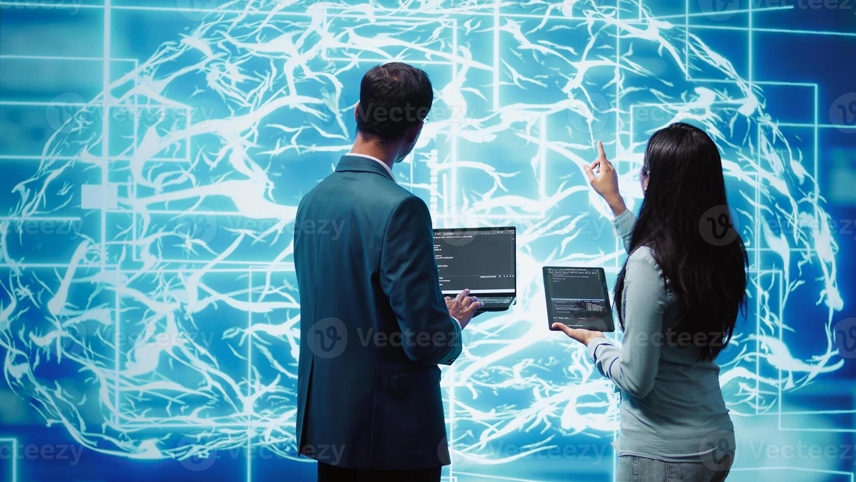 Team of admins using tablet and laptop to maintenance artificial intelligence neural networks. Teamworking IT staff members using AI system aiding in processing and transmitting information, camera B Pro Photo