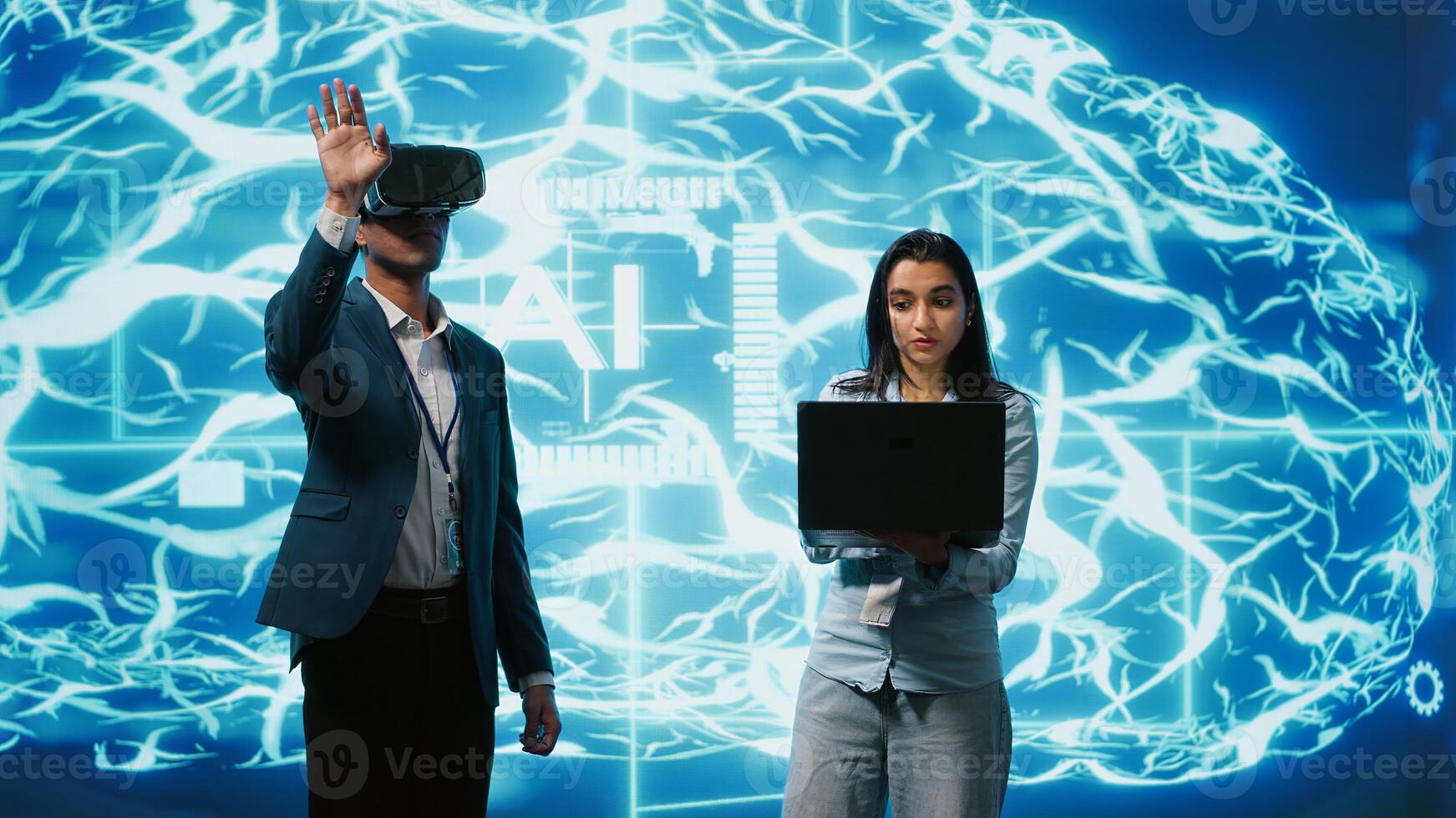 Technician wearing VR headset looks at hologram of artificial intelligence human brain simulation, assisted by colleague using laptop. Team of programmers interacting with AI visualization, camera A Pro Photo