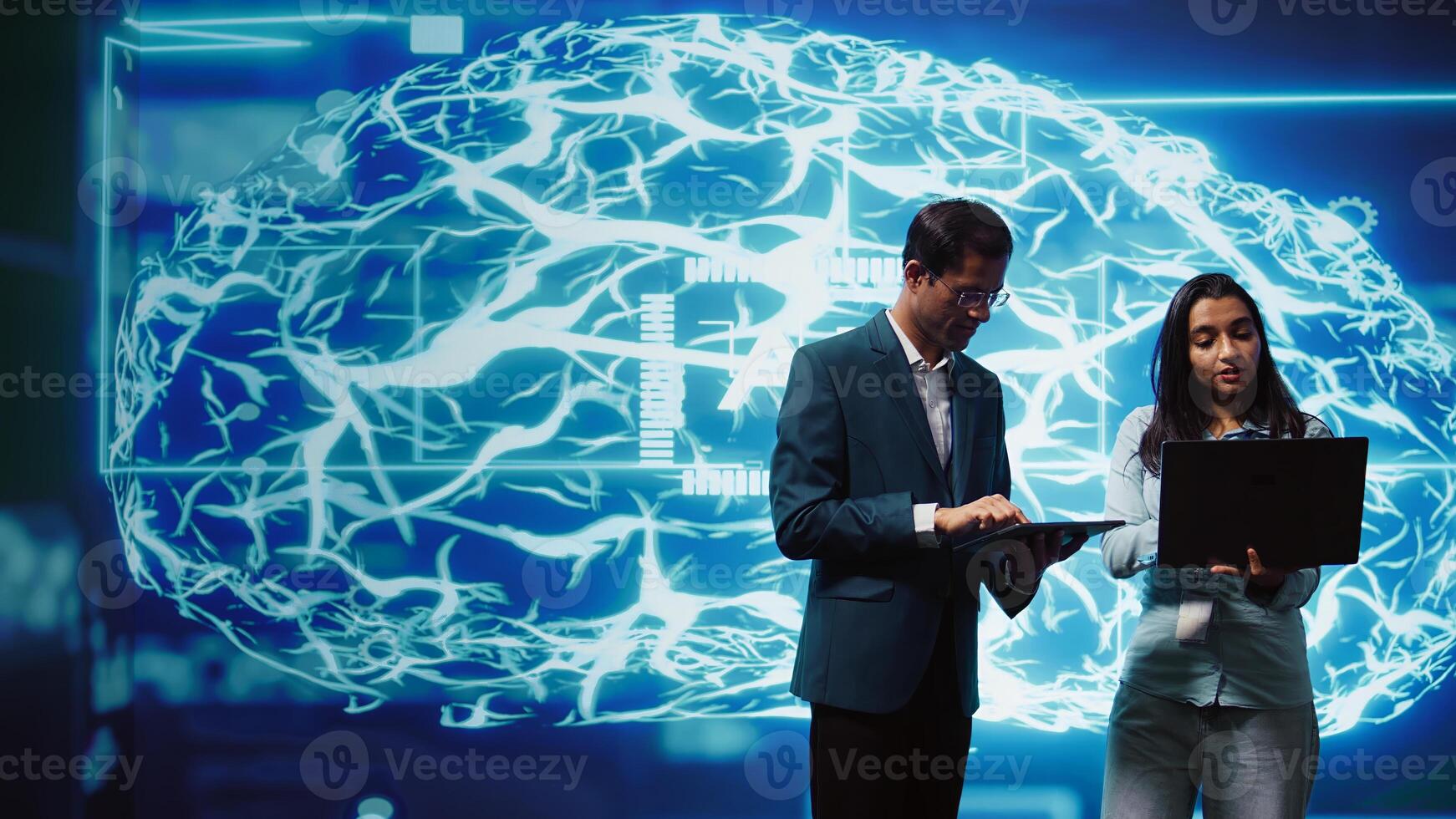 IT department colleagues solving tasks on laptop and tablet, running artificial intelligence programming scripts. Team of engineers brainstorming ways to develop AI applications, camera B Pro Photo