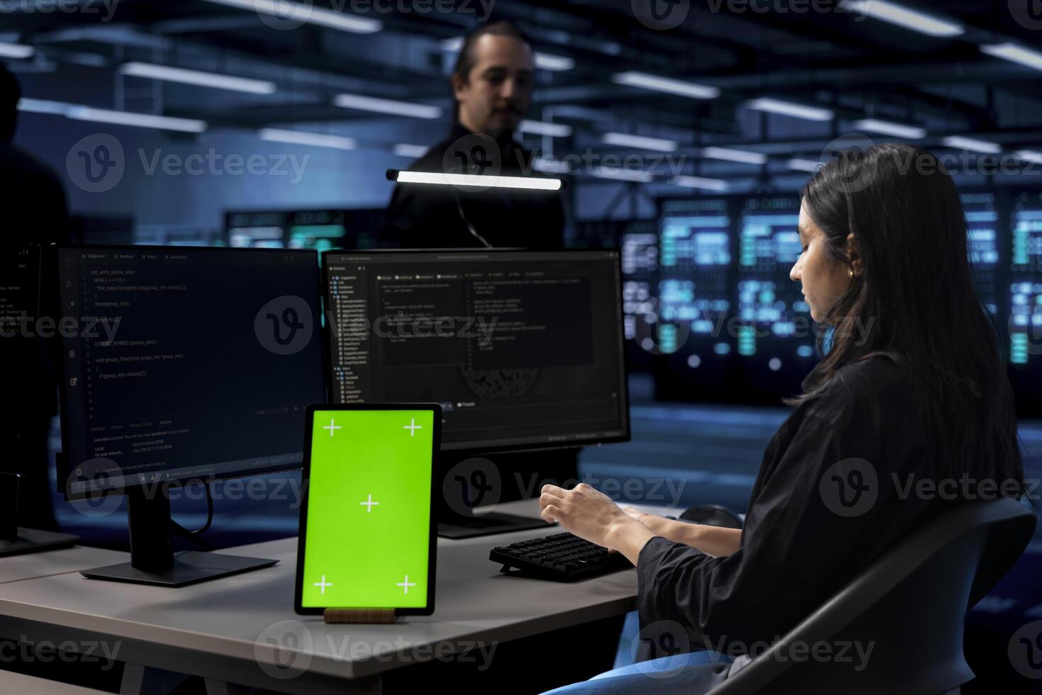 Engineer in data center uses isolated screen tablet to update systems, protecting servers from software vulnerabilities. IT expert uses chroma key device to look for errors affecting servers Pro Photo