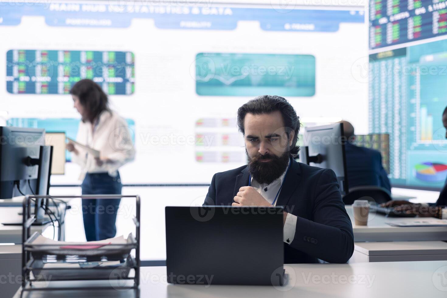 General director examining statistics big data on computer in a control room, makes a briefing report. Business manager studying sales numbers to adapt within market conditions. Pro Photo