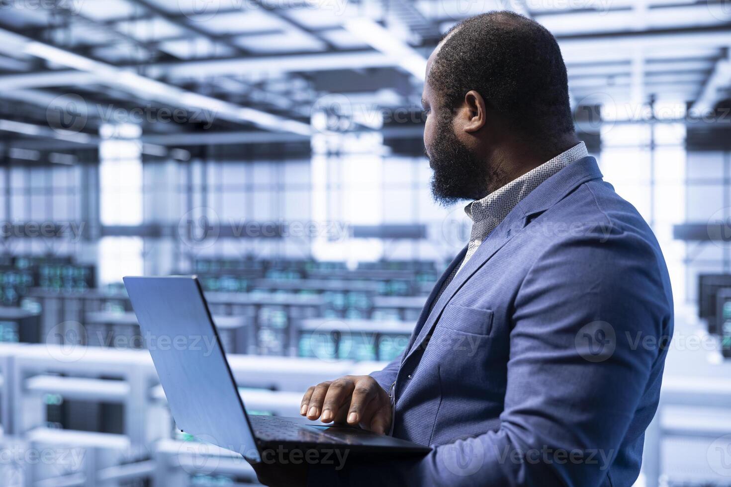 Programmer in data center implementing backup solutions to protect against infrastructure data loss using laptop. Modern workplace IT professional resolving technical issues using notebook Pro Photo