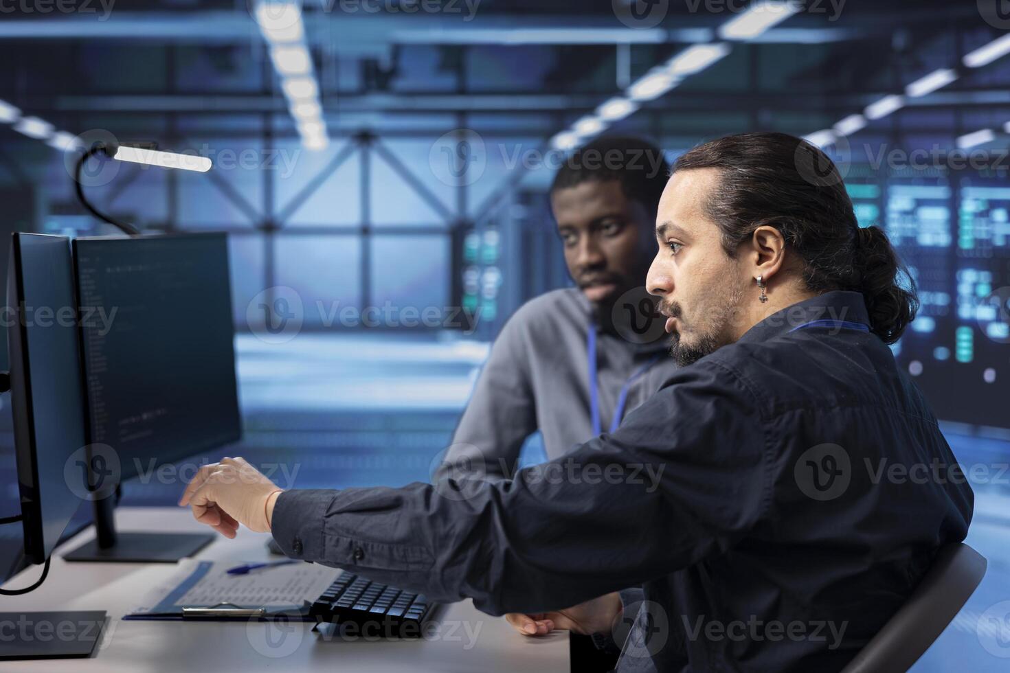 Engineers doing maintenance in server hub to extend equipment life span and avoid downtime. Coworkers monitoring mainframes for overheating problems and power fluctuations Pro Photo
