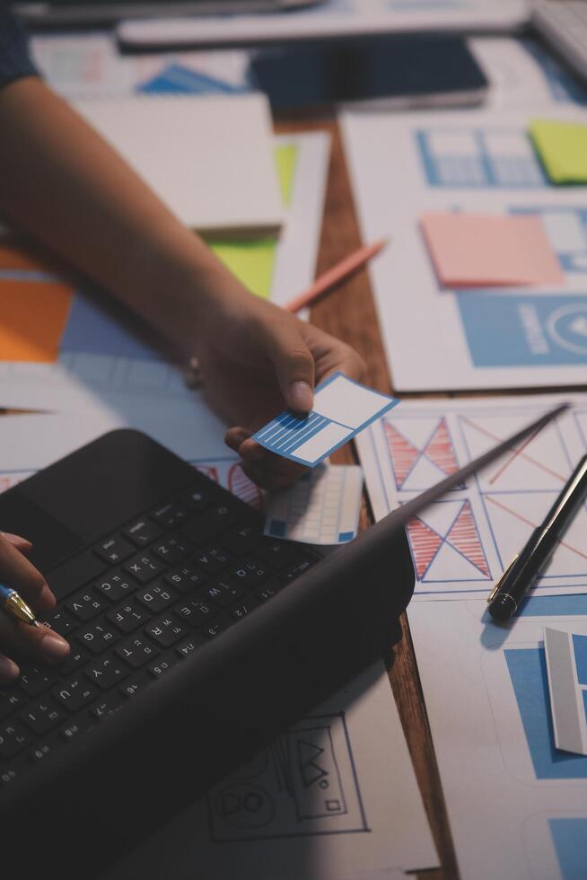 The designer team is designing the uxui system to make the uxui system work well on new phones and support system updates. Website development concept UI UX front end designer Free Photo