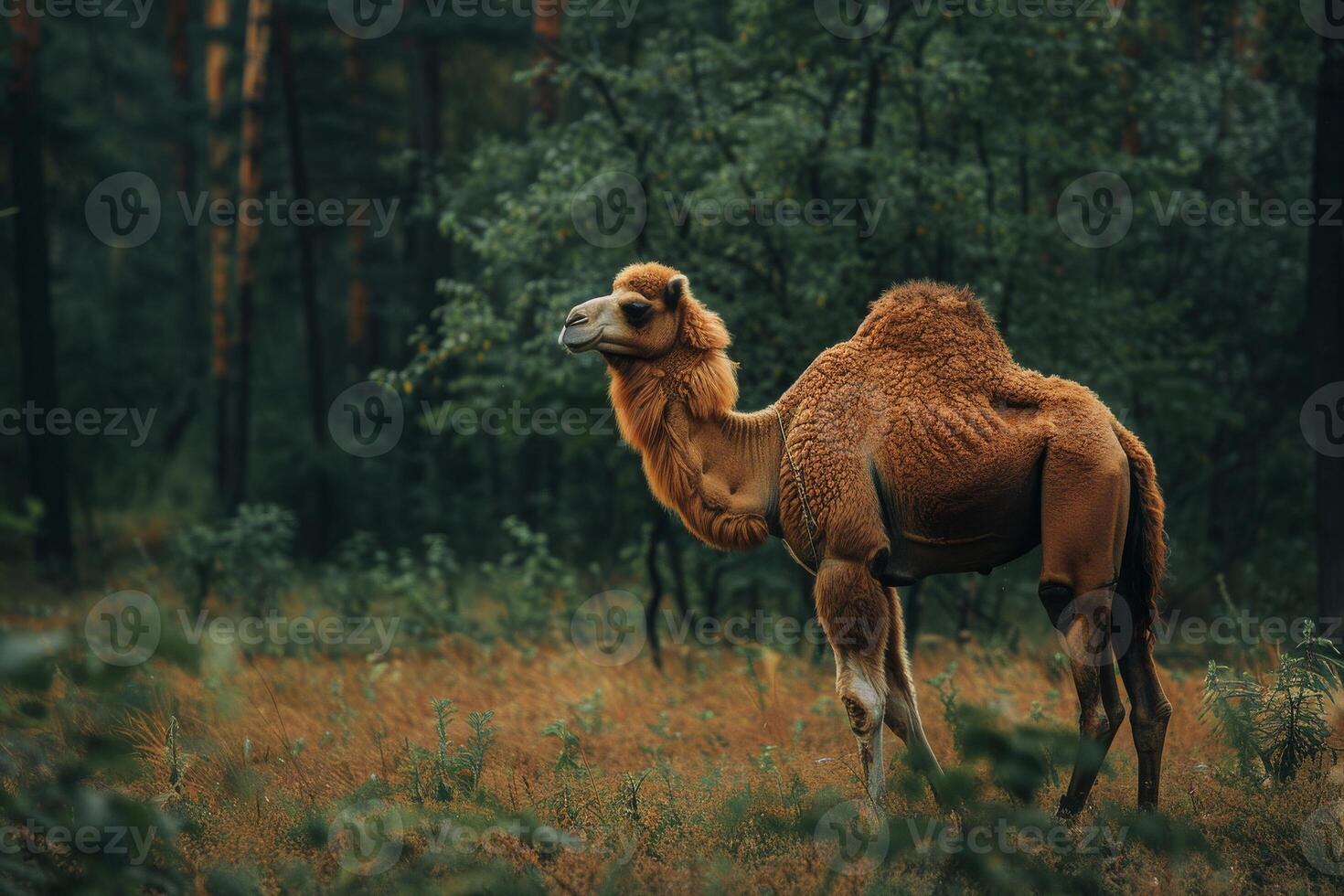 A camel is standing in the middle of a forest Pro Photo