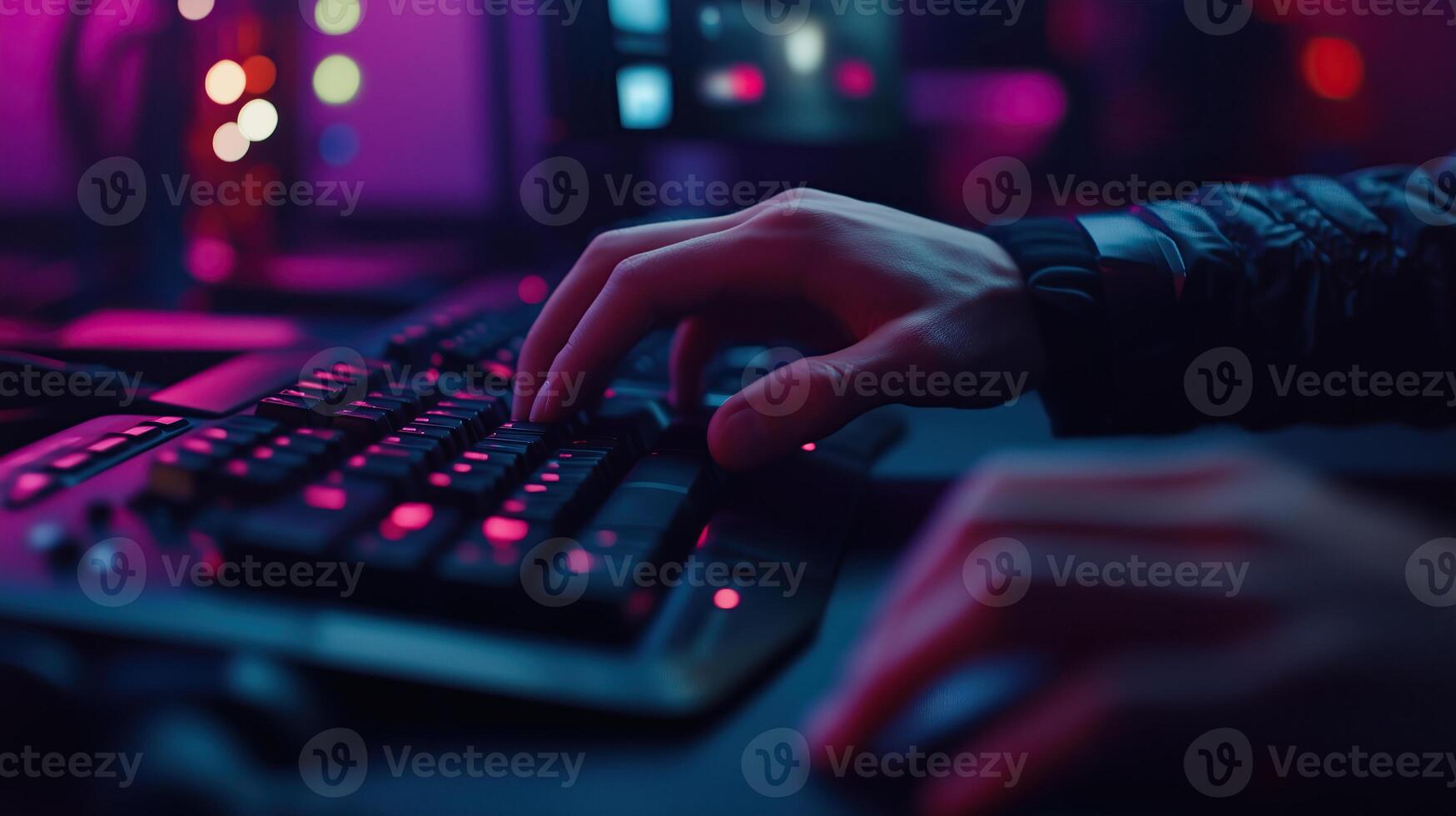 Man using mouse and keyboard to stream online on virtual screen. Pro Photo